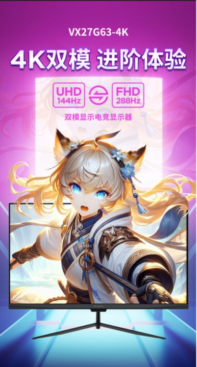 VX27G63-4K的最大亮点之一是其支持UHD 144Hz与FHD 288Hz双模显示,用户可根据使用场景一键切换模式,兼顾画质与流畅度。UHD模式下,显示器提供3840×2160超清分辨率与144Hz刷新率,适合画质要求极高的游戏与影视内容;而在FHD模式下,刷新率提升至288Hz,为FPS、MOBA等高速竞技类游戏提供更顺滑的操作体验。