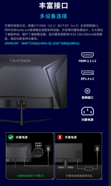 配备双HDMI 2.1与双DP 1.4接口,支持多设备连接与音频输出,满足多场景使用需求。内置电源设计简化桌面布线,背部支持VESA壁挂安装,兼顾空间整洁与布局灵活。