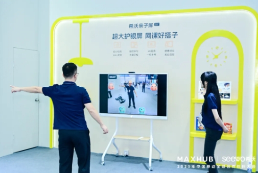 另外,希沃亲子屏也成为现场备受关注的家庭教育产品。只见55英寸的亲子屏上搭载了各款功能,包括AI绘本阅读、AI体育互动等。不少家长亲自体验,在屏幕面前玩得不亦乐乎。一位观众表示:“当前自己对丰富的学习资源会比较关注,希沃这些有趣的功能也能让孩子们更有兴趣学习。”